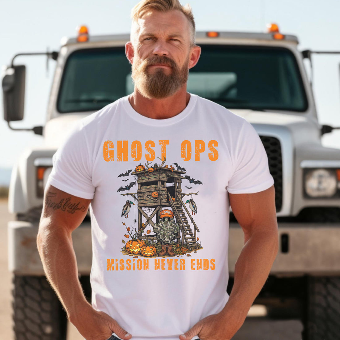 Ghost Ops Mission Never Ends Veteran Halloween Funny Military Patriotic Ghost T-Shirt