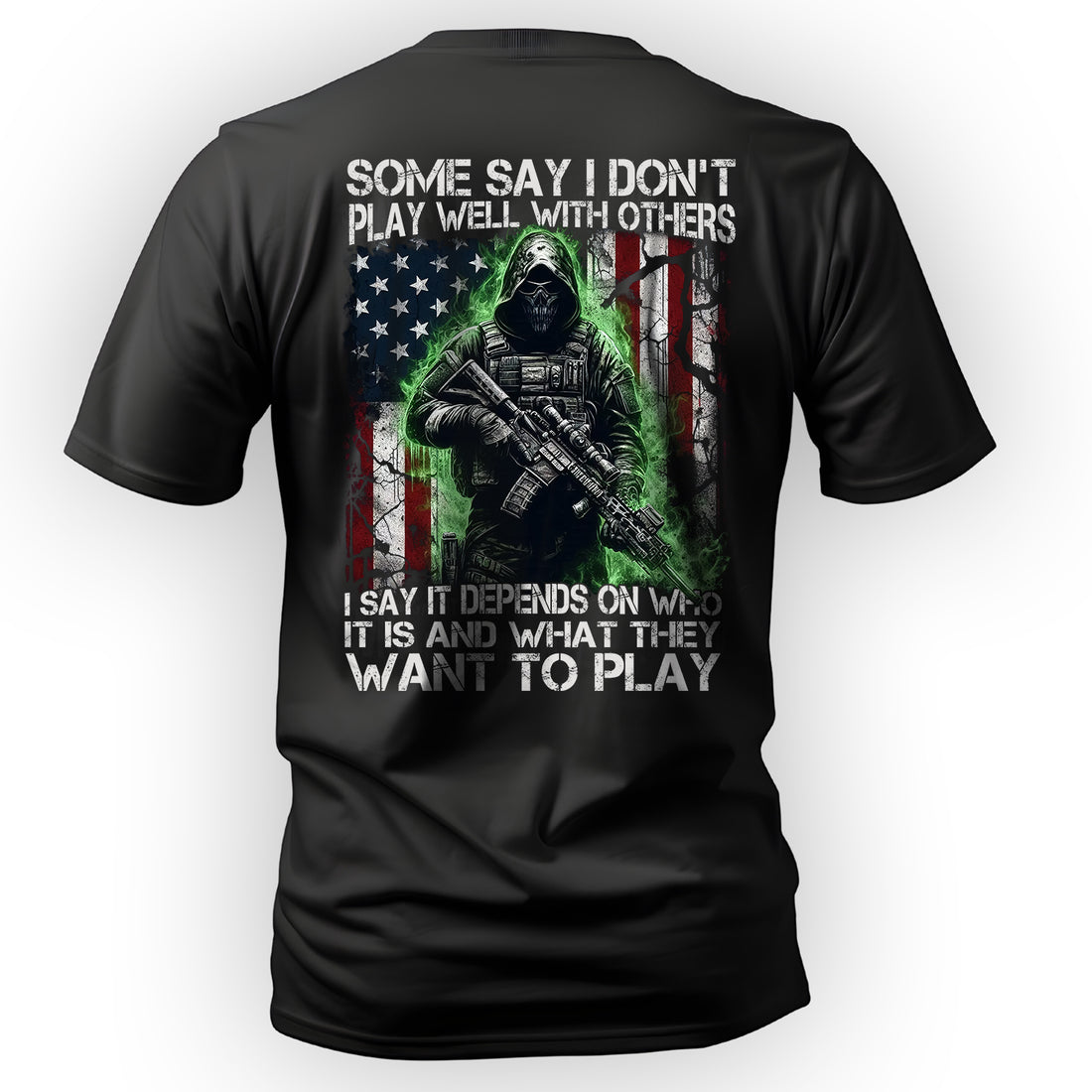 Some Say I Don’t Play Well – Patriotic T-Shirt Honor your individuality and service with...