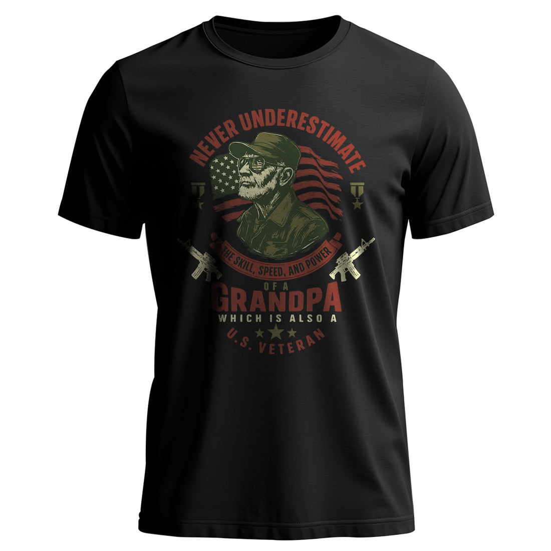 Never Underestimate a Veteran Grandpa – Patriotic T-Shirt Honor the legacy of our heroes with...