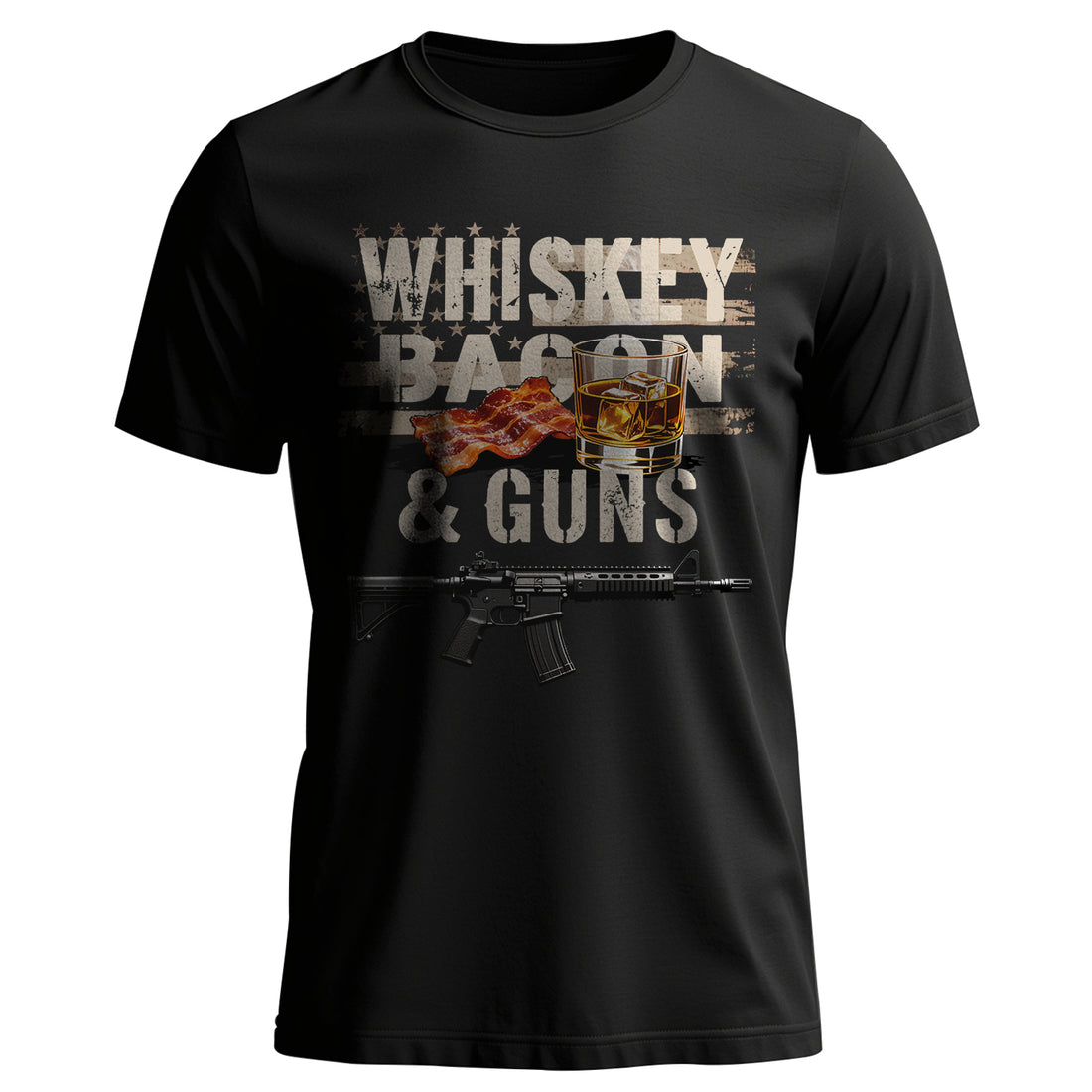 Whiskey, Bacon & Guns – Patriotic T-Shirt Celebrate your freedom and heritage with this bold...