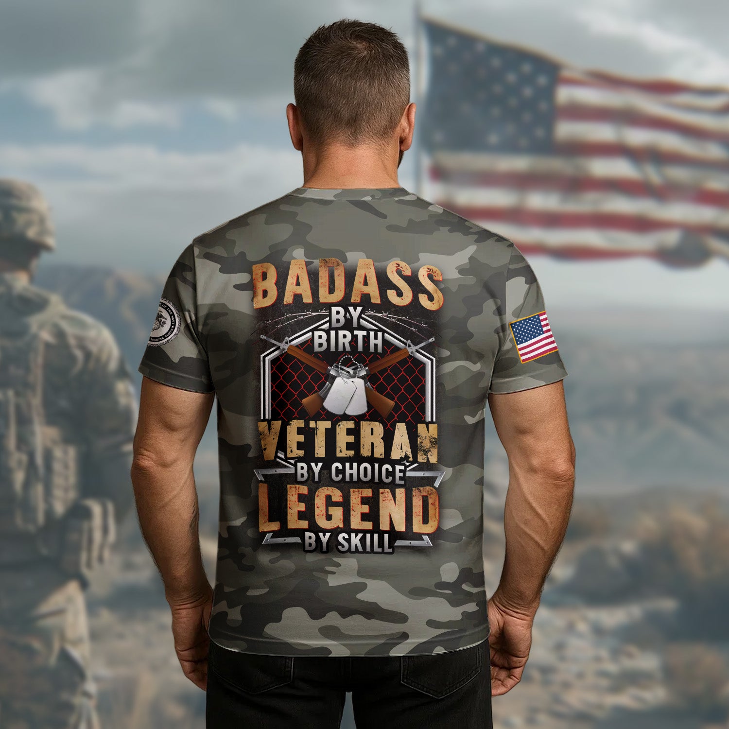 Honor your service and showcase your pride with our "Badass by Birth" Veteran T-Shirt. This striking design celebrates the courage and commitment of those who have served.
