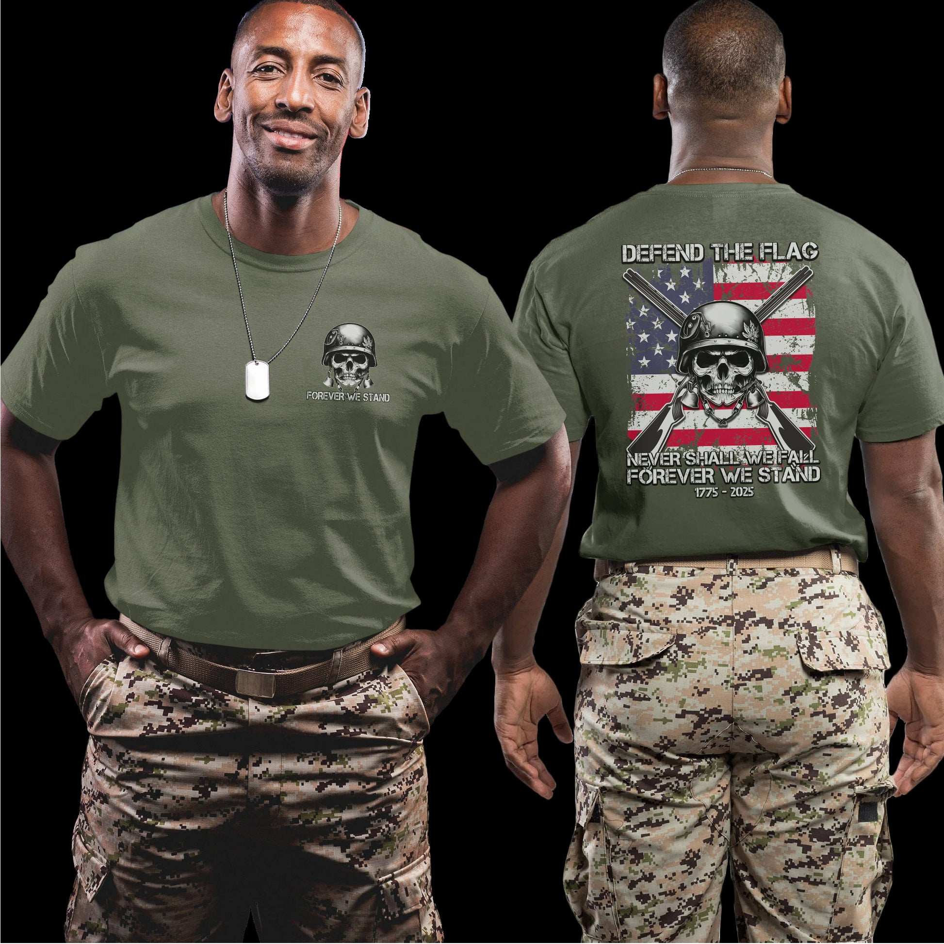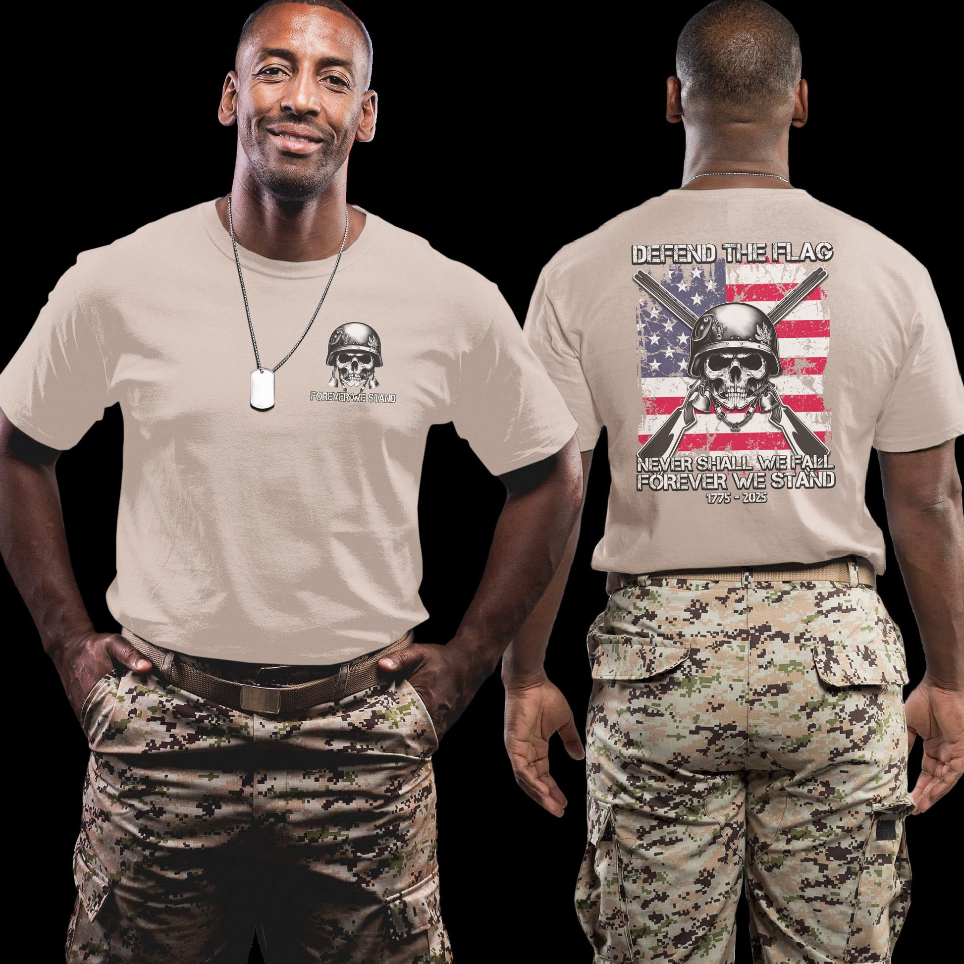 Defend the Flag Never Shall We Fall Forever We Stand US Military Patriotic Tribute T-Shirt