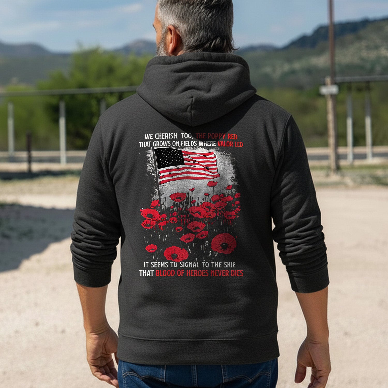 Featuring a powerful design that intertwines the beauty of poppies with the American flag, this hoodie symbolizes courage, brotherhood, and the enduring freedom we cherish. Wear it as a badge of honor and a reminder of the blood that has secured our liberties.
