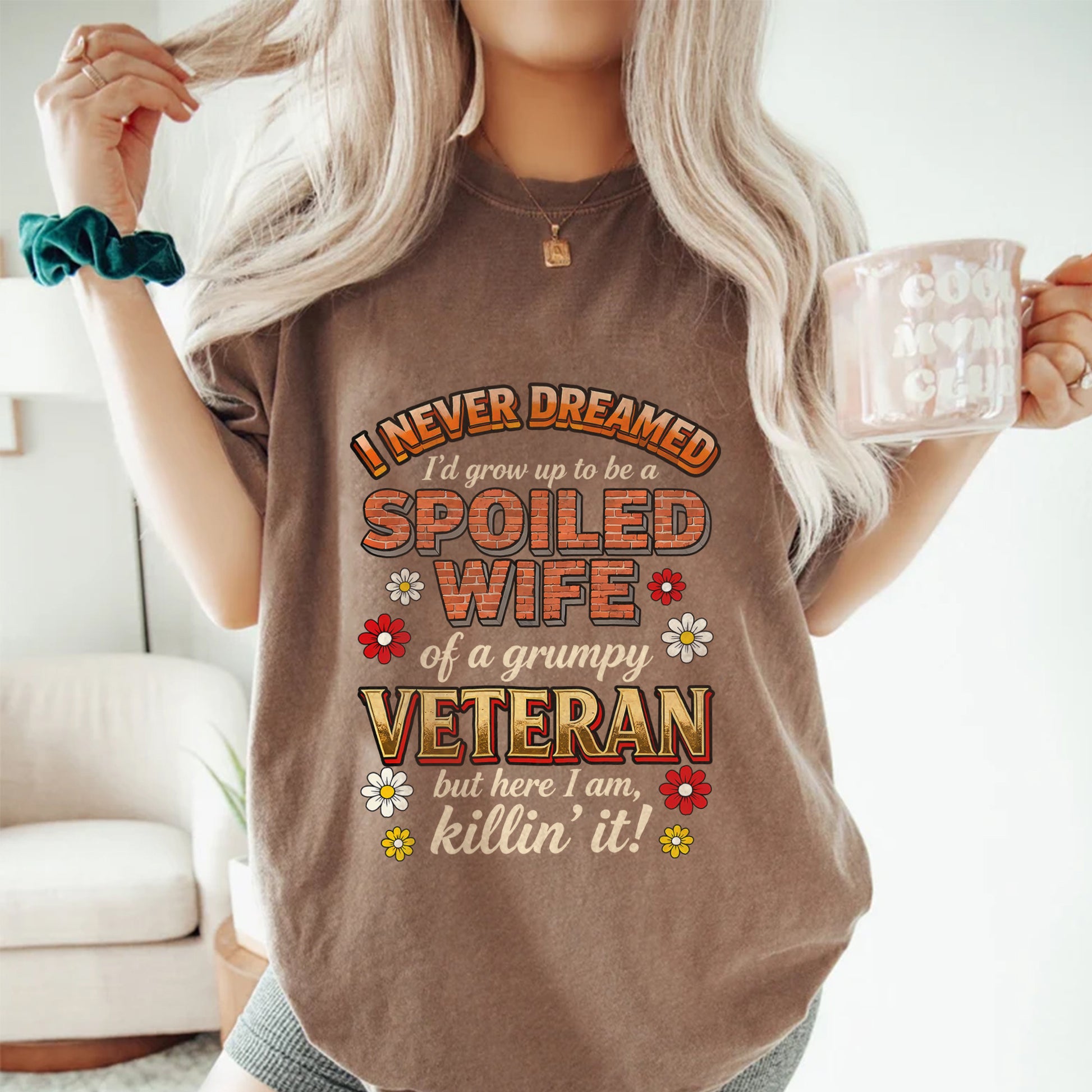 "I NEVER DREAMED I'd grow up to be a SPOILED WIFE of a grumpy VETERAN, but here I am, killin' it!"