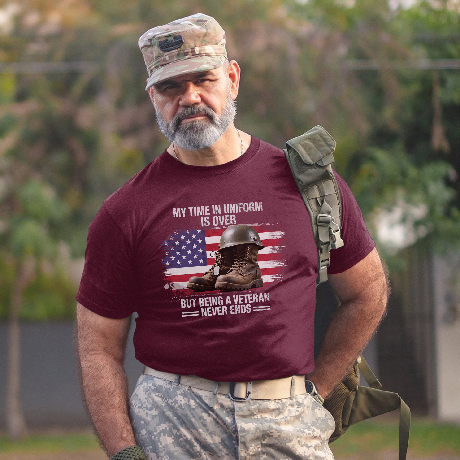 Honor the unwavering spirit of our veterans with this powerful tribute shirt. A reminder that while service may end, the dedication to our country lasts a lifetime.