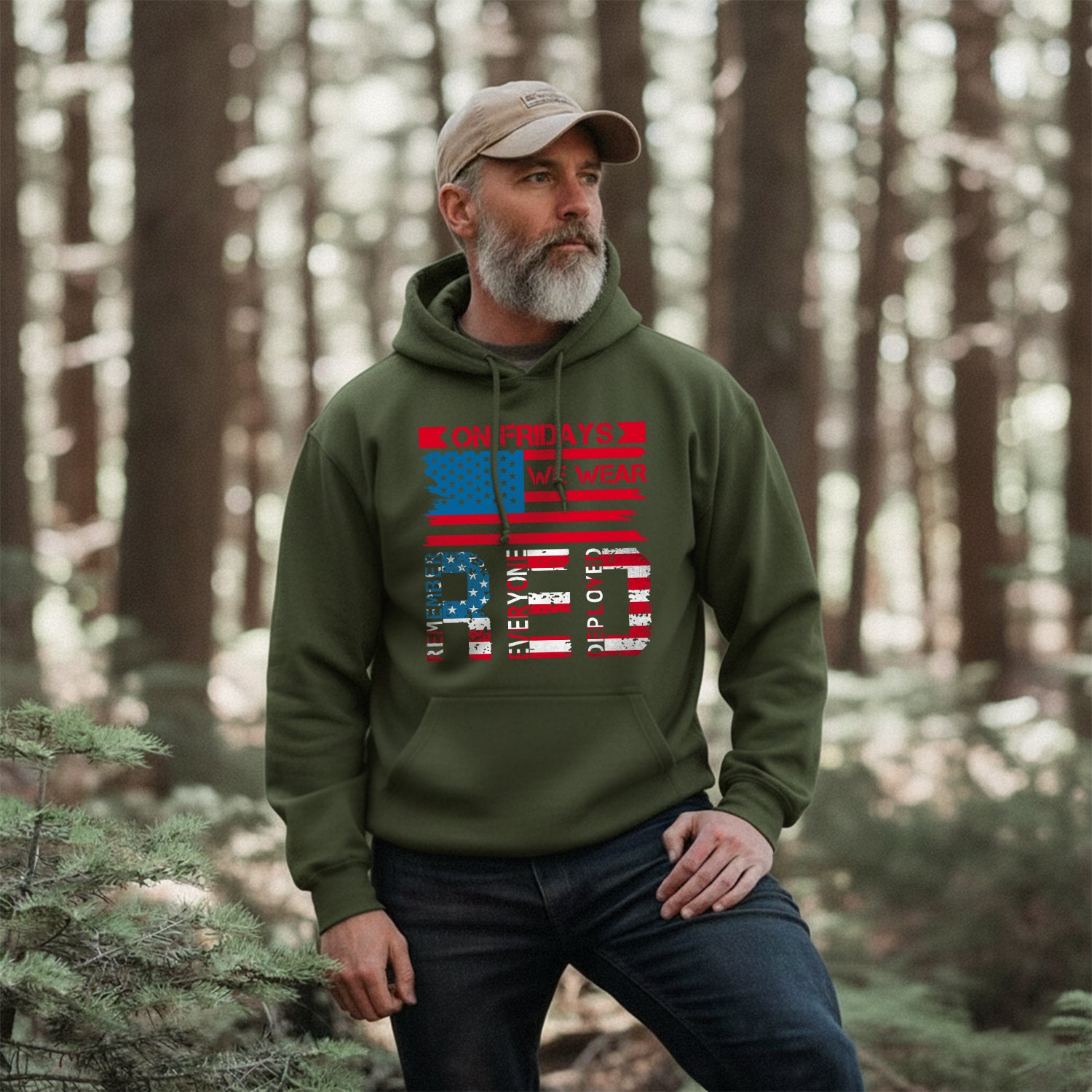 Honor our brave service members with this striking hoodie, designed to inspire pride and unity. Wear it on Fridays to show your support for those deployed.