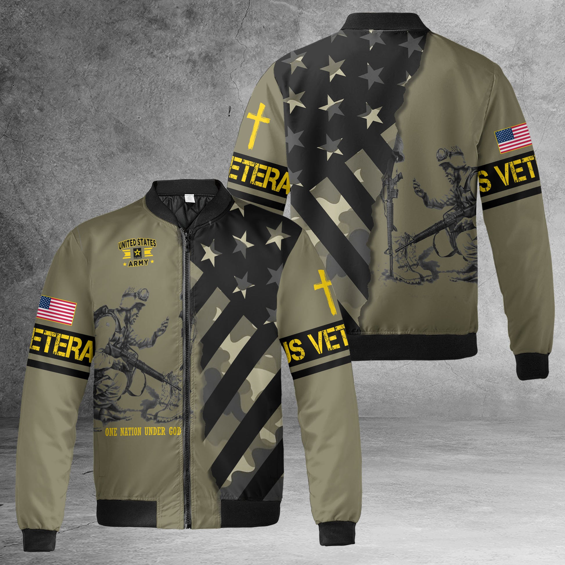 One Nation Under God United in Faith Freedom and Strength Honoring Veterans and Country All-over Print Bomber Jacket