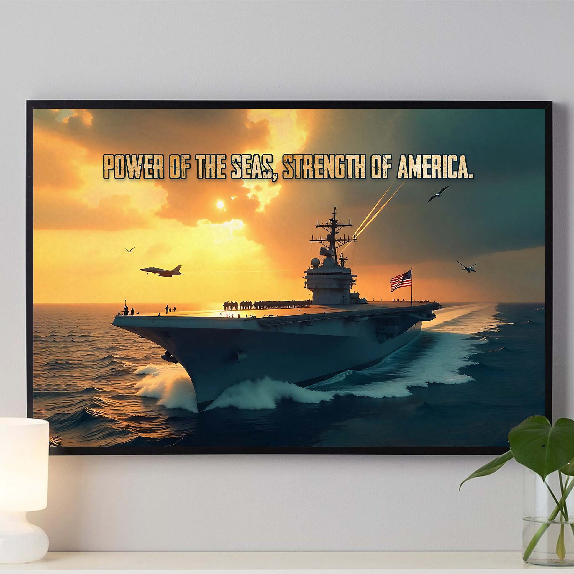 Featuring a powerful naval vessel against a breathtaking sunset, this Poster symbolizes courage, unity, and the unwavering spirit of those who protect our freedoms.