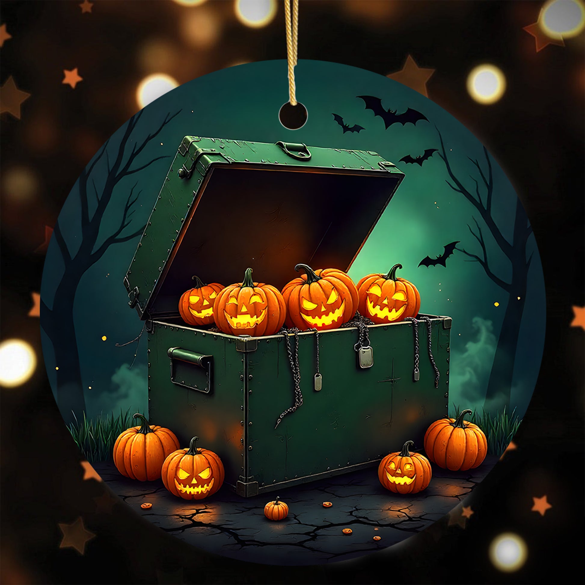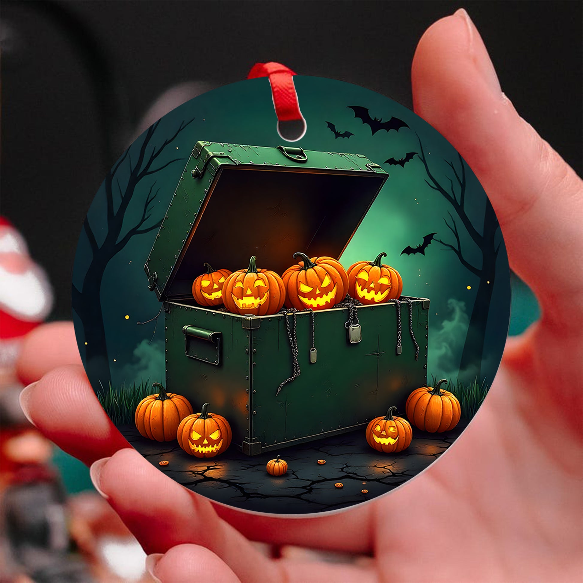 Featuring a whimsical design of glowing pumpkins and a vintage chest, this piece symbolizes courage and the joy of togetherness during the fall festivities. It's a perfect reminder of cherished moments spent with loved ones.
