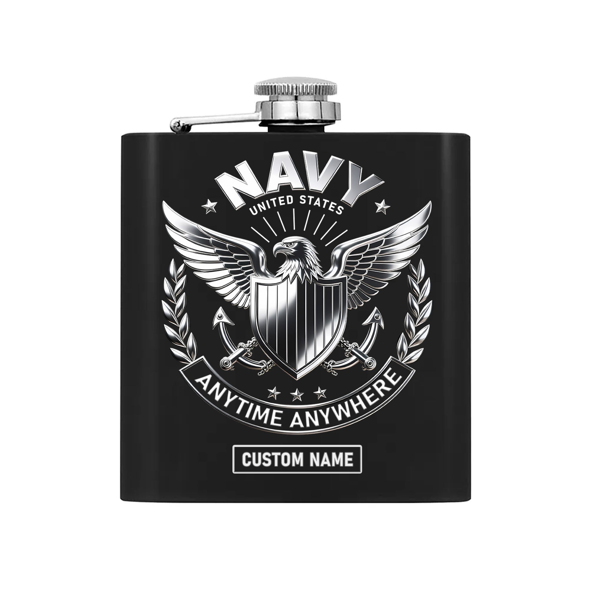 United States Navy Anytime Anywhere Military Patriotic Veteran Personalized Hip Flask Set