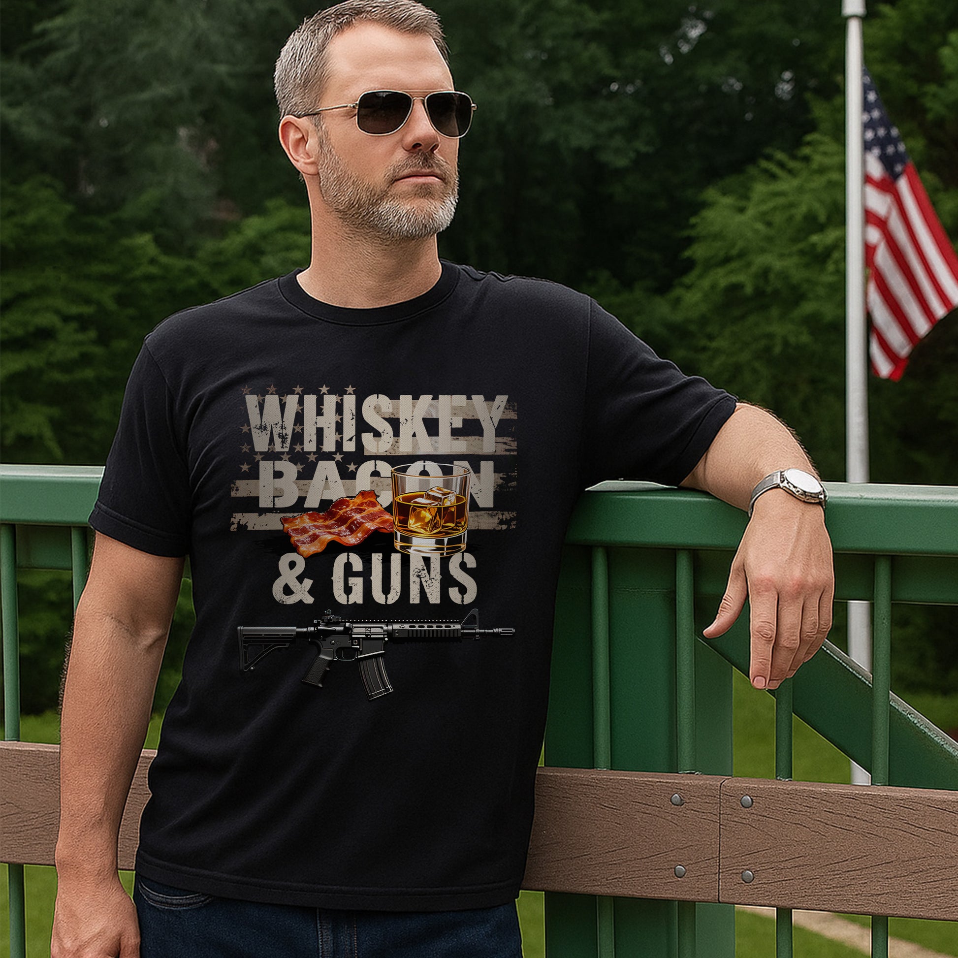 Whiskey Bacon and Guns Proud US Military Veteran Patriotic Humor and Pride T-Shirt