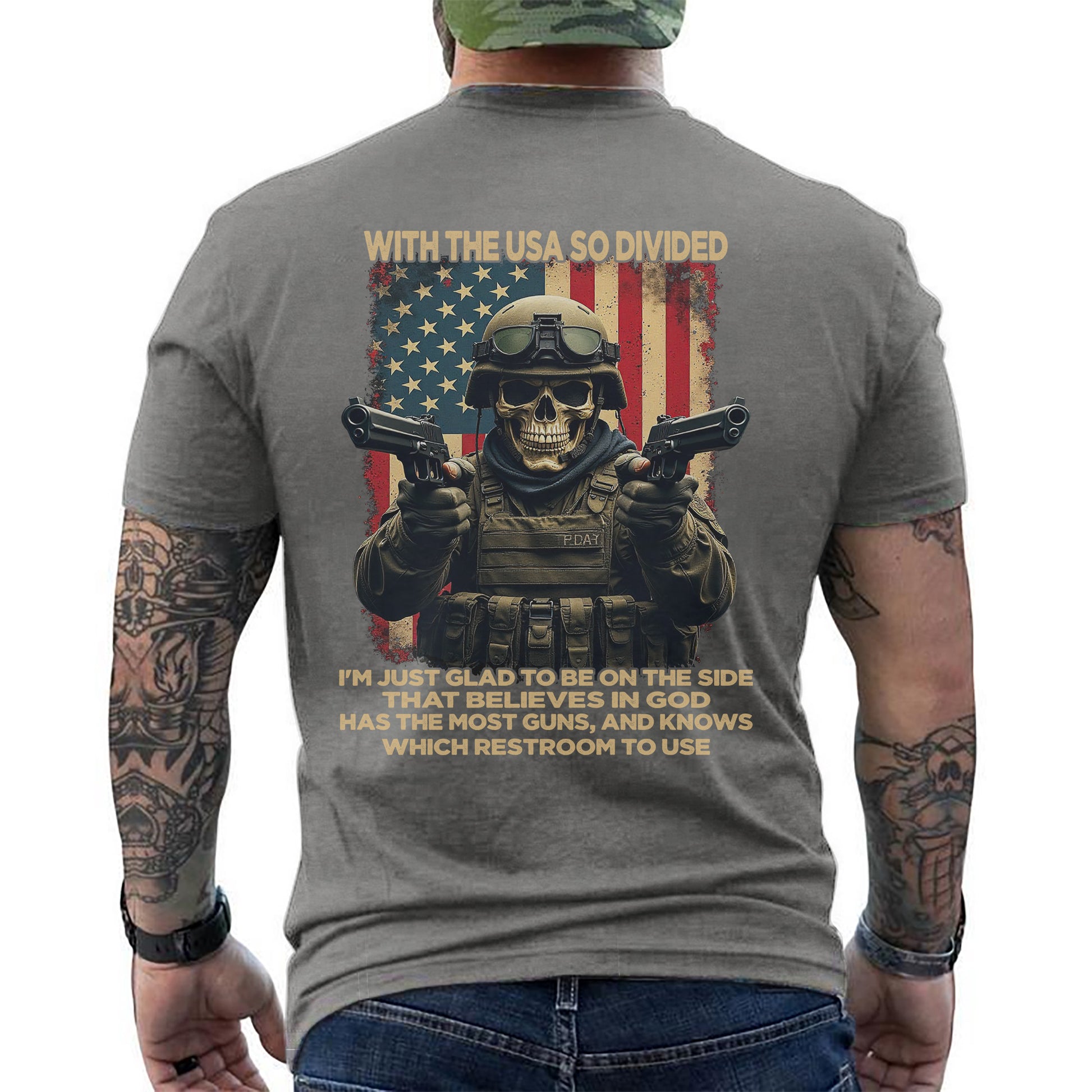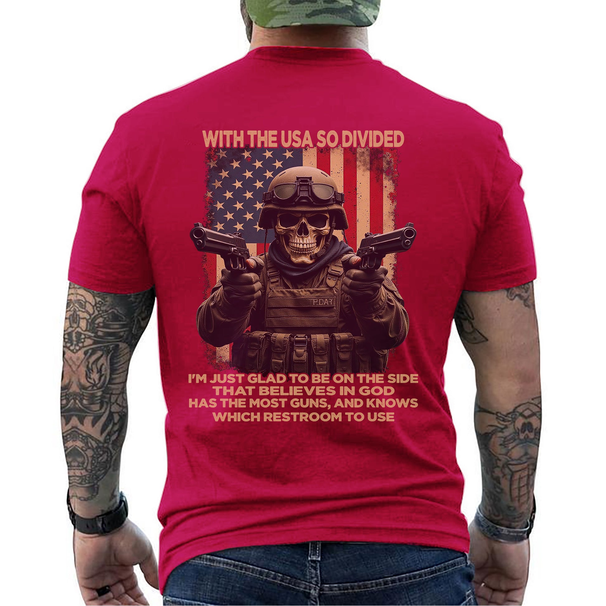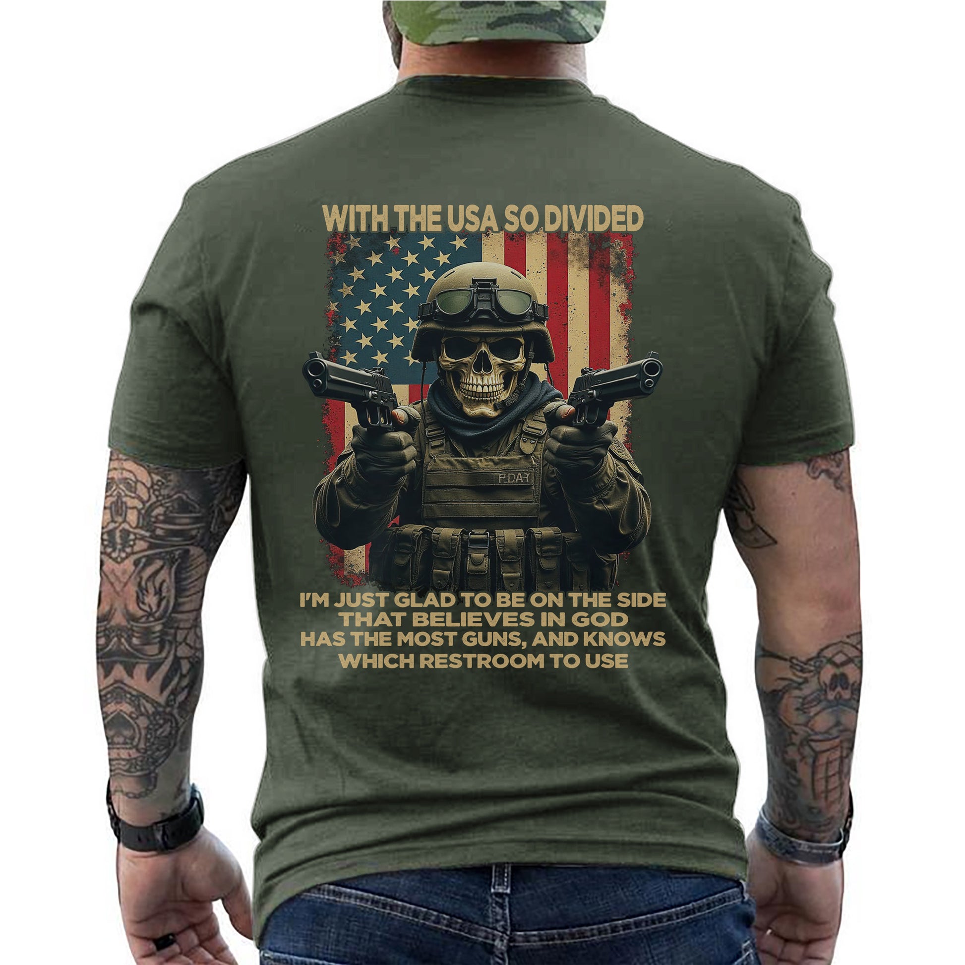 With the USA So Divided I’m Glad to Be on the Side That Believes in God Has Guns and Knows Which Restroom to Use T-Shirt